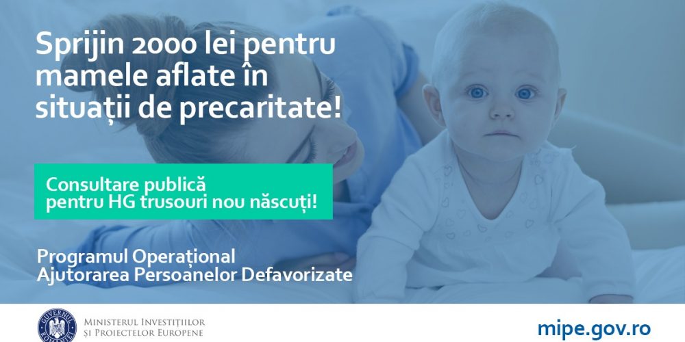Ministerul Investițiilor și Proiectelor Europene a lansat în consultare publică  proiectul de HG care va reglementa modul prin care vor fi acordate trusourile pentru nou-născuți, de care vor beneficia mamele cu posibilități materiale reduse.