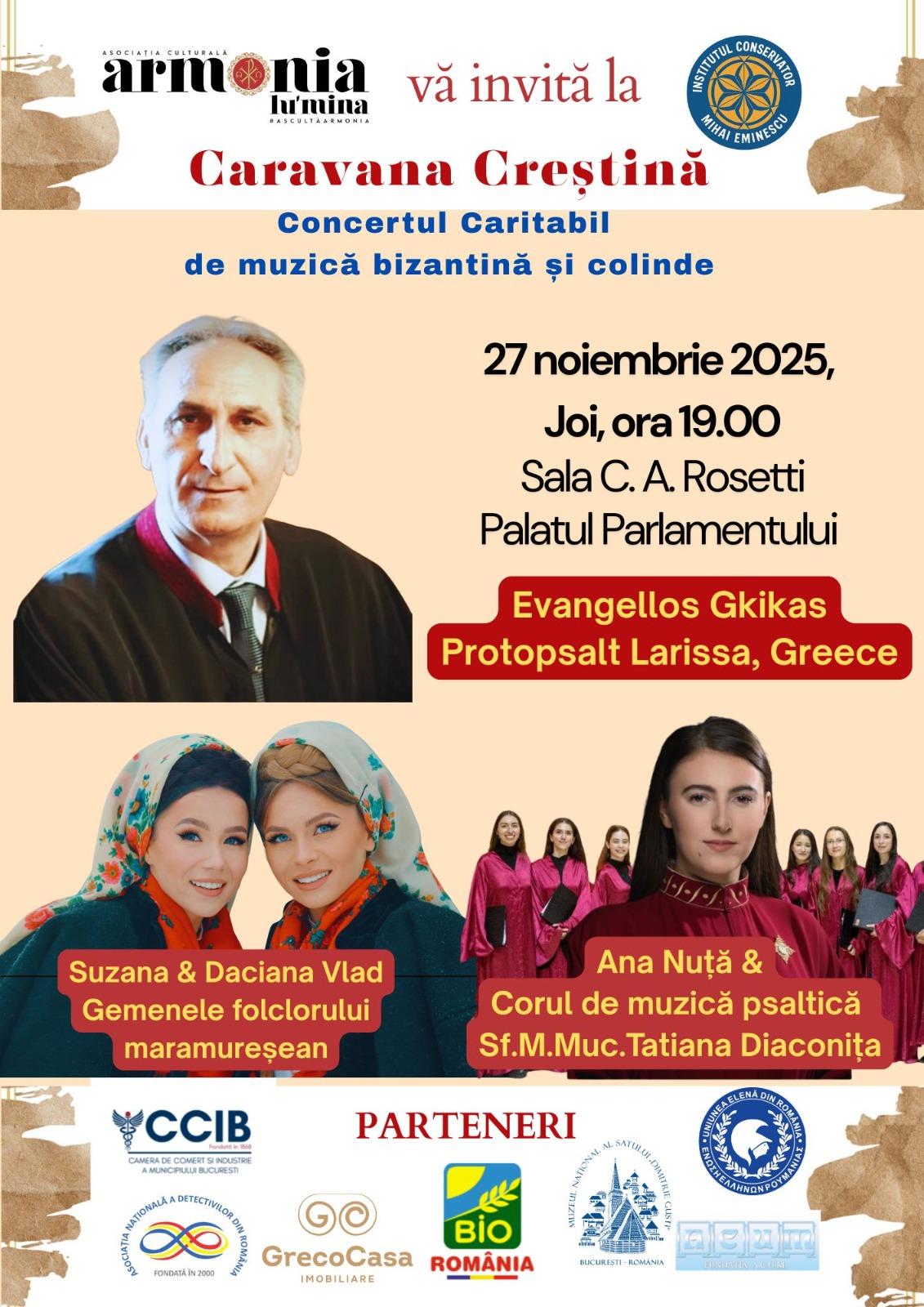 Asociația Culturală „Armonia lu’mina”, în parteneriat cu Institutul Conservator „Mihai Eminescu”, are plăcerea de a anunța organizarea Concertului Caritabil de Muzică Bizantină și Colinde, care va avea loc în Sala C. A. Rosetti a Palatului Parlamentului, intrarea S2, Str. Izvor nr. 2-4, Sector 5, București.