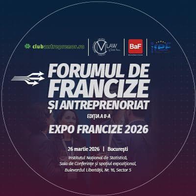Club Antreprenor, CMV Law by Mihaela Mocanu și BaF – Biroul de Afaceri în Franciză organizează joi, 26 martie 2026, Forumul de francize și antreprenoriat, ediția a II-a și Expo Francize 2026.