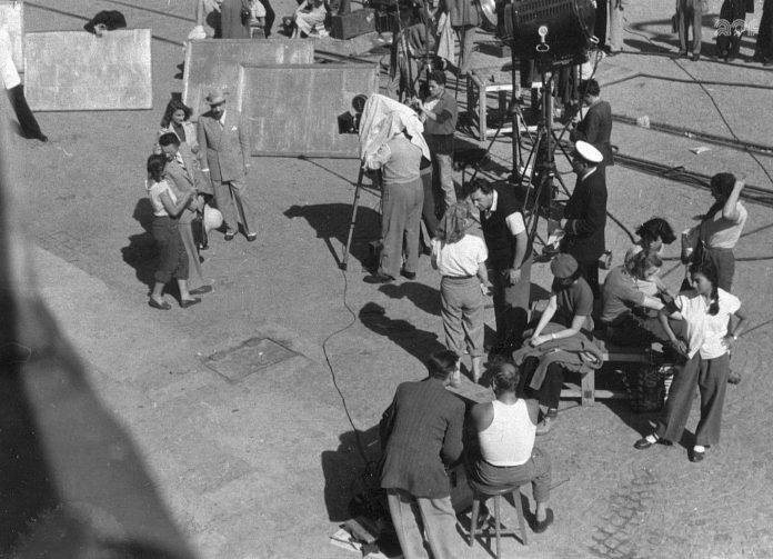 Fotografie de platou cu echipa de filmare. Imaginea surprinde atmosfera de pe platoul de filmare și oferă indirect indicii despre organizarea echipei de filmare pe platou, în epocă.